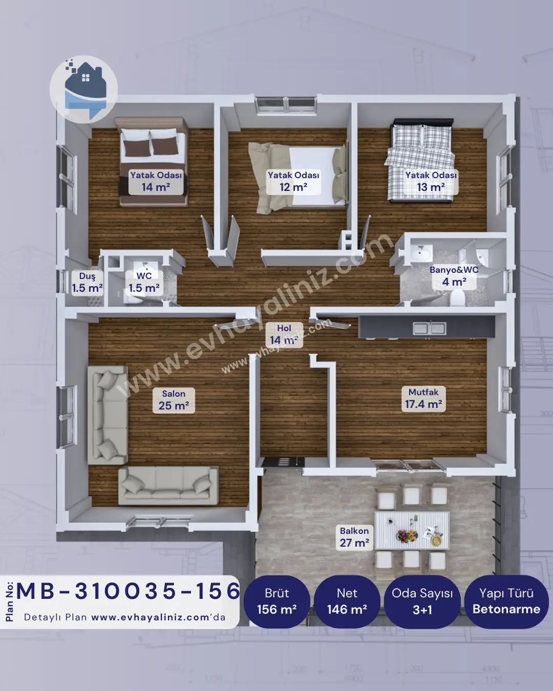 3+1 Müstakil Ev Planı (156 m²) Daha Az